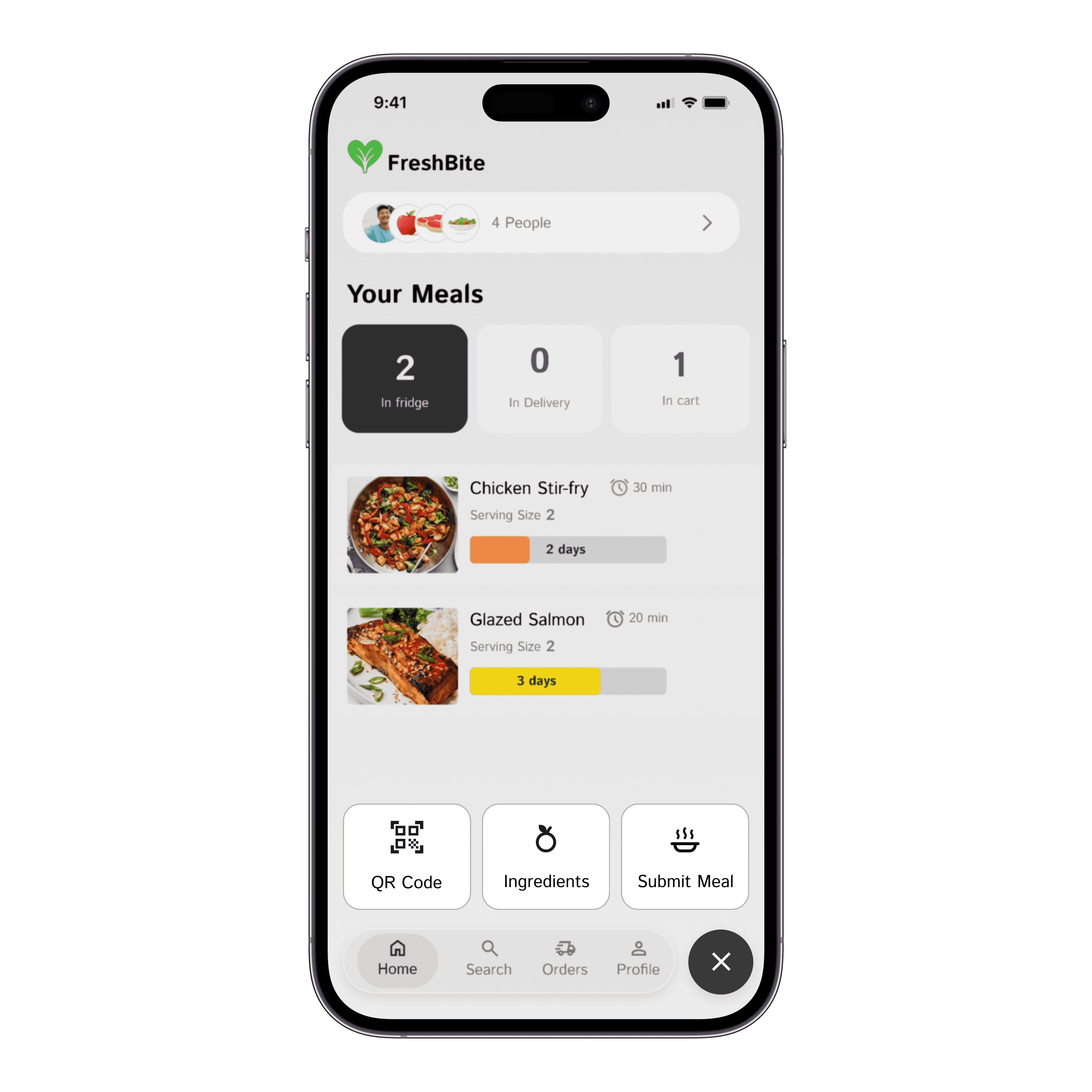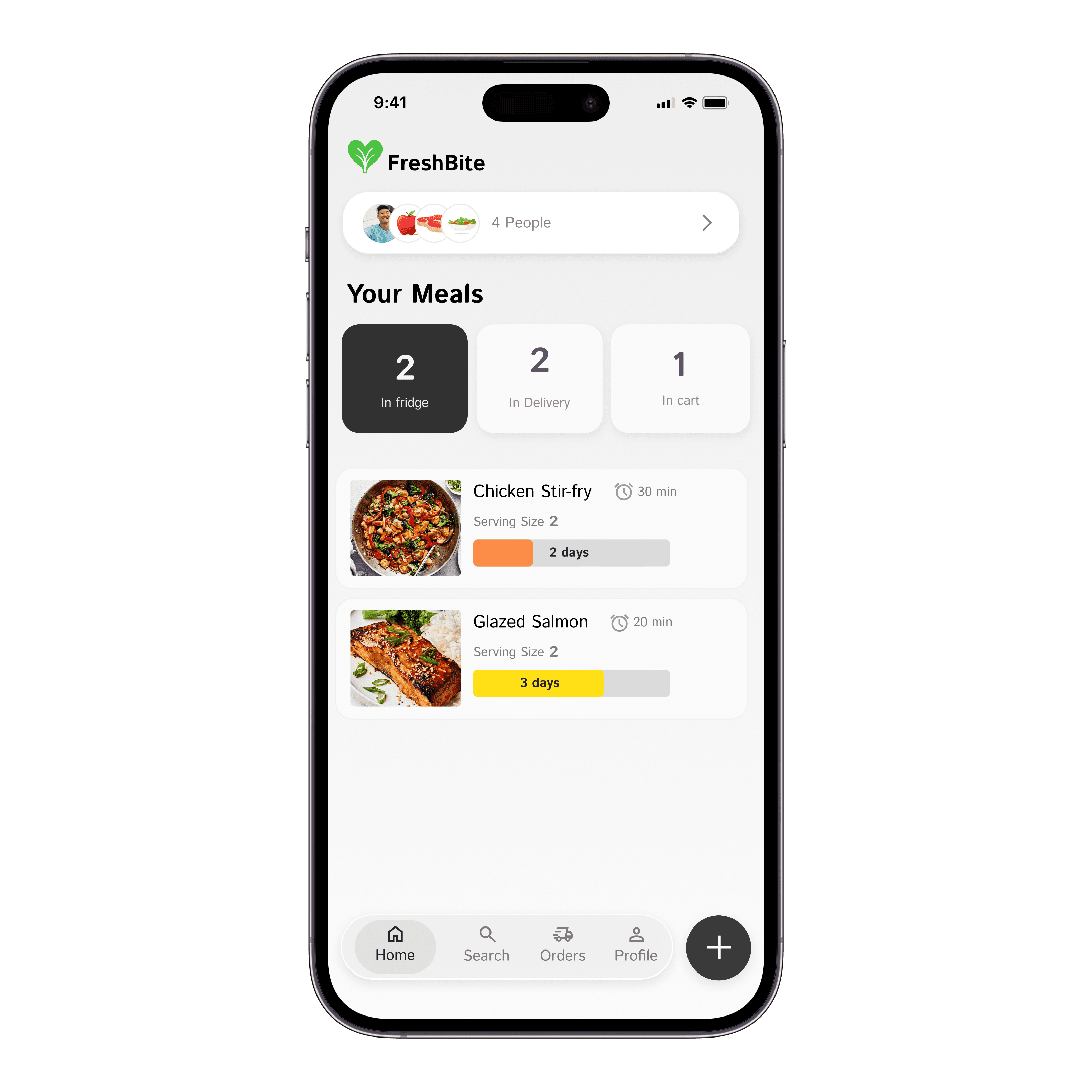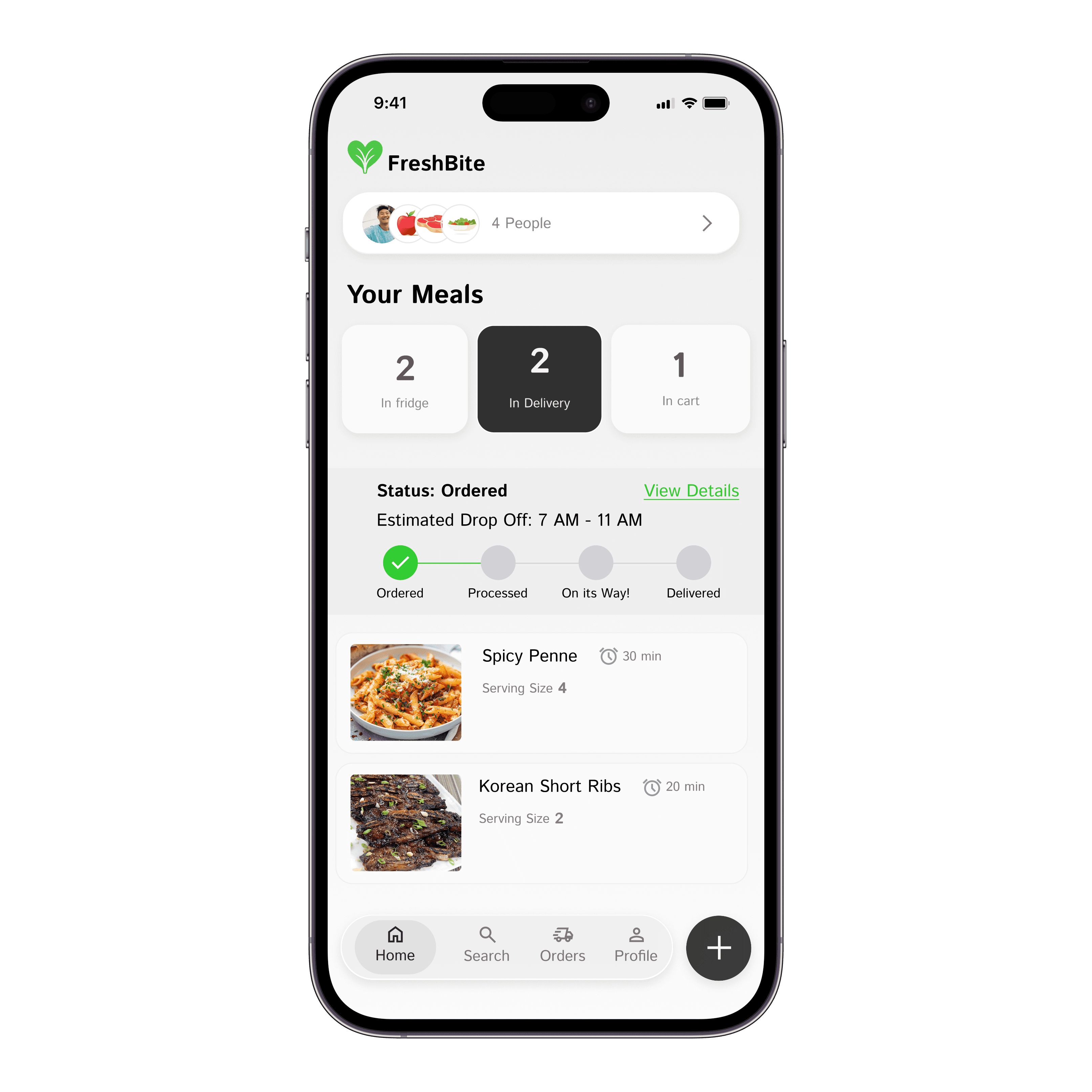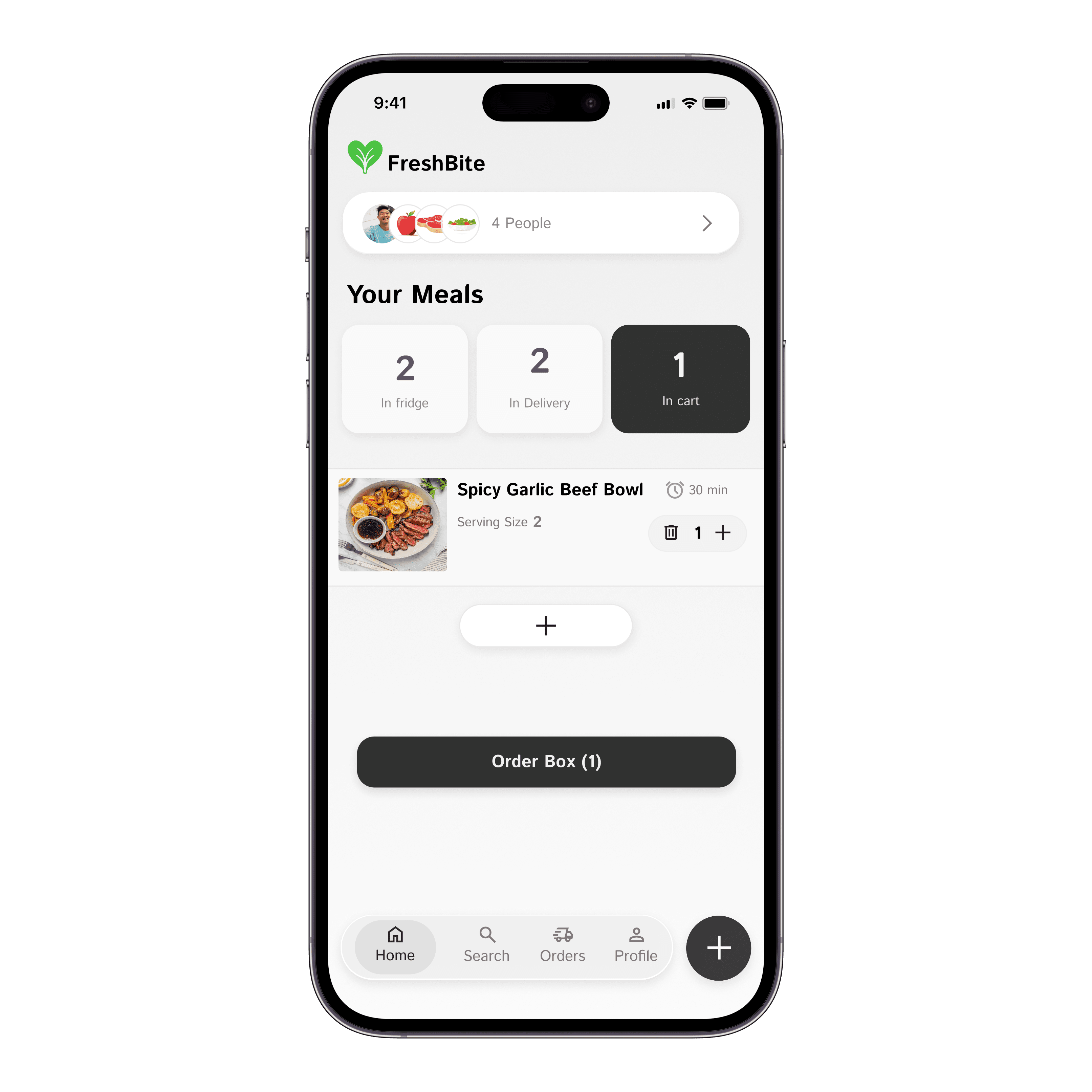 The home page acts as a meal command center, showing meals at home, in delivery, and in the cart to limit of mental effort required to track meal status.